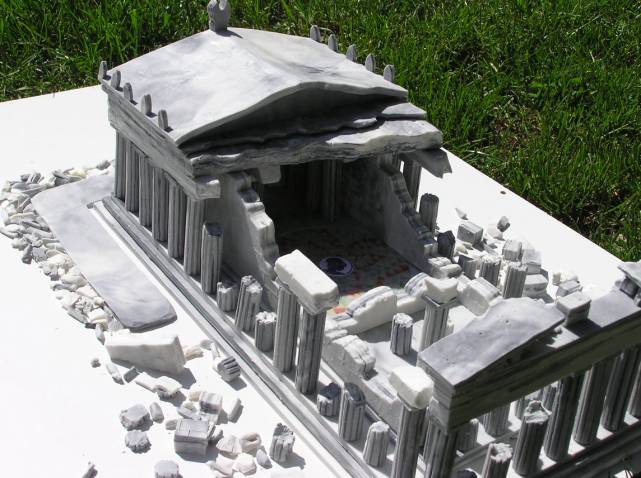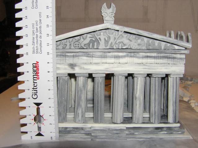 wurde von Hand geschnitzt, die Säulen, die Giebel und das Mauerwerk, auch