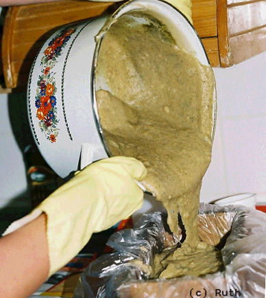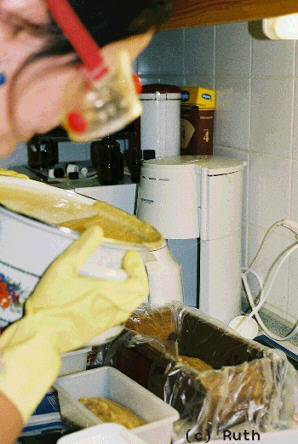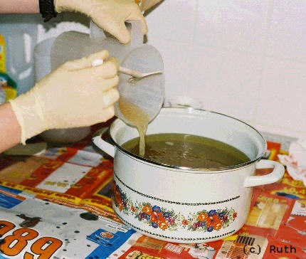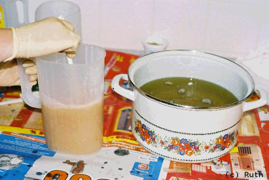 | Hier wird sie schon eifrig gerührt, unsere Lauge - der Wasseranteil war